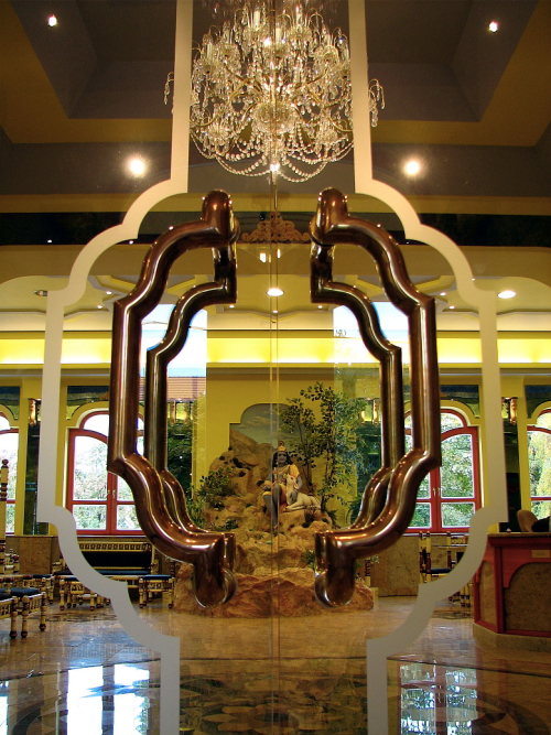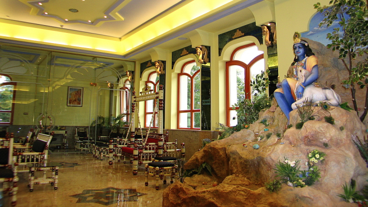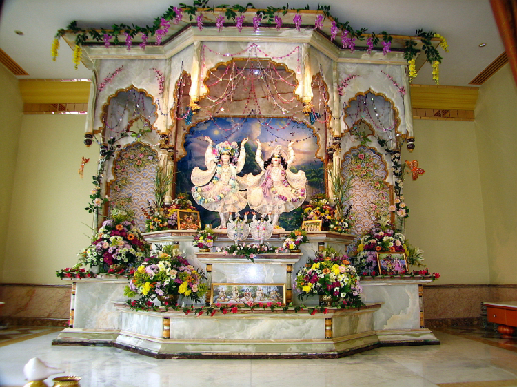 A benti terek egy modern múzeum és egy indiai palota ötvözetének hangulatát idézik. A templombelső makulátlanul tiszta, szellős és napfényes – a mennyezetbe épített tetőablakoknak is köszönhetően. Csillárokkal, sok üvegfelülettel, csillogó és fénylő olasz márvány folyosókkal díszített terek, kézzel festett Gujarat-i bútorok és Sri Sri Dayal Nitai Vijay Gauranga lélegzetelállítóan gyönyörű márvány szobra teszik varázslatossá a templomot.