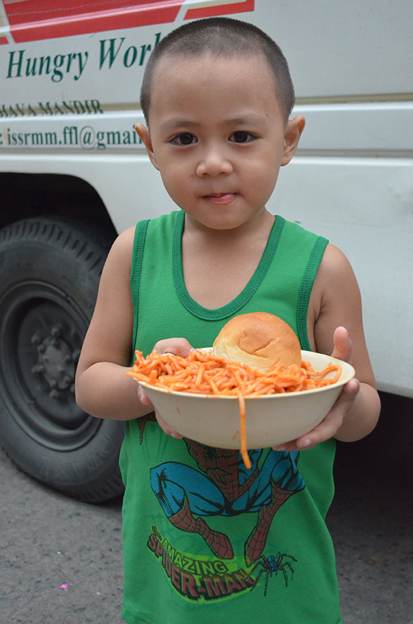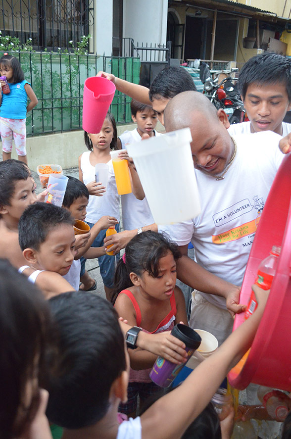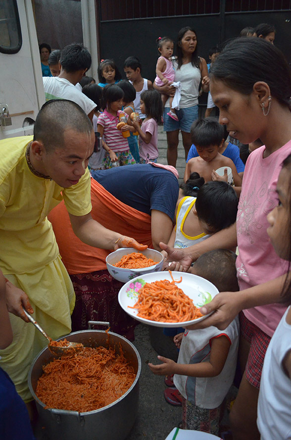 A Krisna-hívők profiljuknak megfelelően elsősorban ételosztással kívánják segíteni a rászorulókat. A helyzet azonban rendkívül nehéz, mivel nem csak az élelmiszer alapanyagokból és tiszta ivóvízből van hiány, a helyszínt egyelőre csupán a hadsereg közreműködésével lehetséges megközelíteni. „A fővárosból másfélnapos szárazföldi út majd még 12 órás hajóút megtétele szükséges, hogy a legérintettebb Leyte szigetére érkezzünk. Helikopterekkel lenne a legjobb bejutni. Jelenleg járművekre, élelmiszerre és pénzre van szükségünk” – tájékoztat Rádhá-lílá déví dászí, az Ételt az Életért manilai programkoordinátora. „Élelmiszert kell juttatnunk a helybelieknek, de tudni kell, hogy most bármilyen önkéntesi munka nagyon kockázatos. Az emberek megvadultak az éhségtől és a pusztulástól. Egy csomó ember nem evett semmit 5 napja!”.