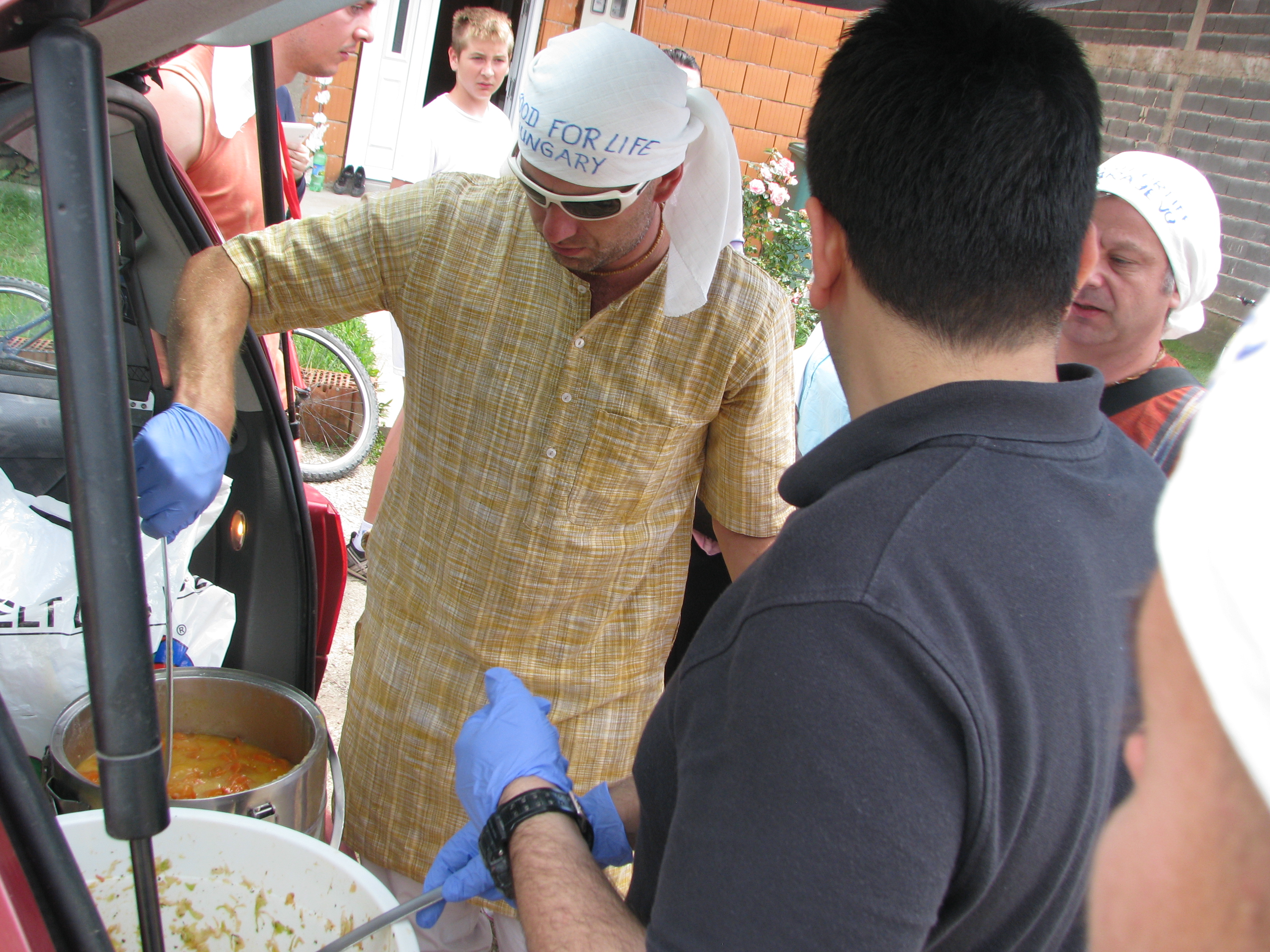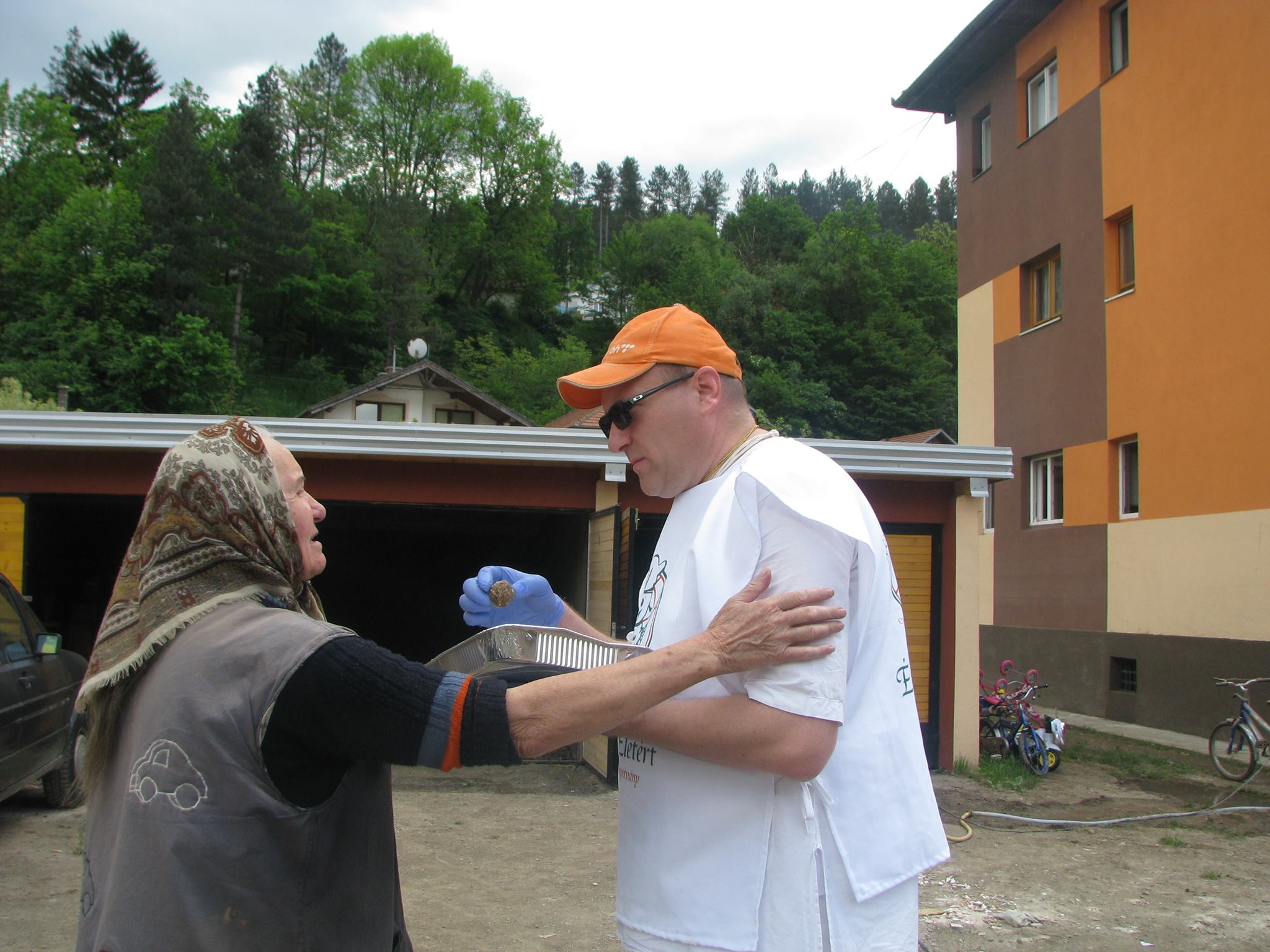 Kezdésképpen egy Bagov Han nevű település menekült központjában nyújtottunk segítséget. Ezen a helyen gyűjtenek ellátmányokat, élelmiszerek és támogatják azokat, akiket az árvíz ide száműzött. A település lakosai befogadták mindazokat, akik mindenüket elveszítették. Így az egyébként is szűkös életkörülményeiket lényegesen megnehezítve töltik napjaikat. Autónkkal utcáról utcára járva osztottunk ételt a kisvárosban. A házakból előbújó emberek először félve nézték, mit keresünk ott. Sajnálatos módon vannak, akik ilyen szörnyűséges helyzetben is hasznot szeretnének húzni mások kárából. Csalók tűntek fel, akik karitatív szervezetként bemutatva magukat segélyszállítmányokat tüntetnek el, vagy épp csak “sztorira” éhesen zaklatják a lakosokat. Ám amikor megértették, hogy miért jöttünk, nagy örömmel fogadtak. Sokak szeme könnybe lábadt. Az éhes emberek fazekaikkal és tányérjaikkal rohamoztak meg minket, mi pedig lelkesen szolgáltuk ki őket.