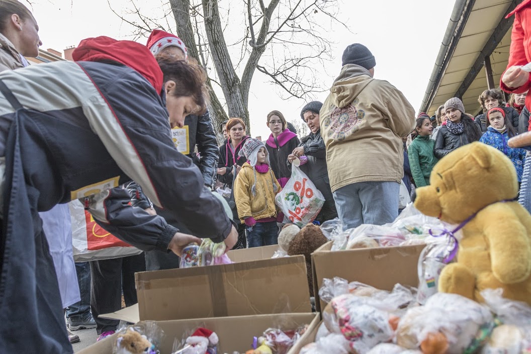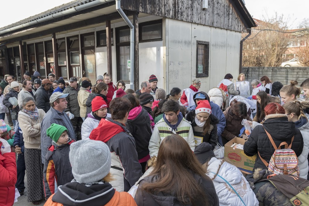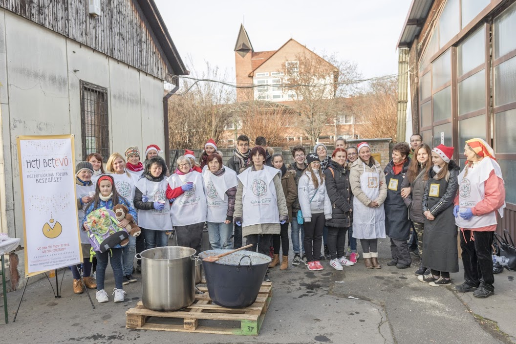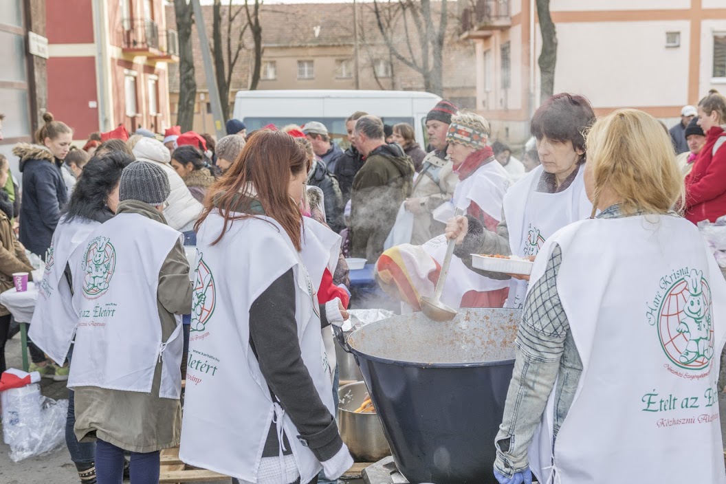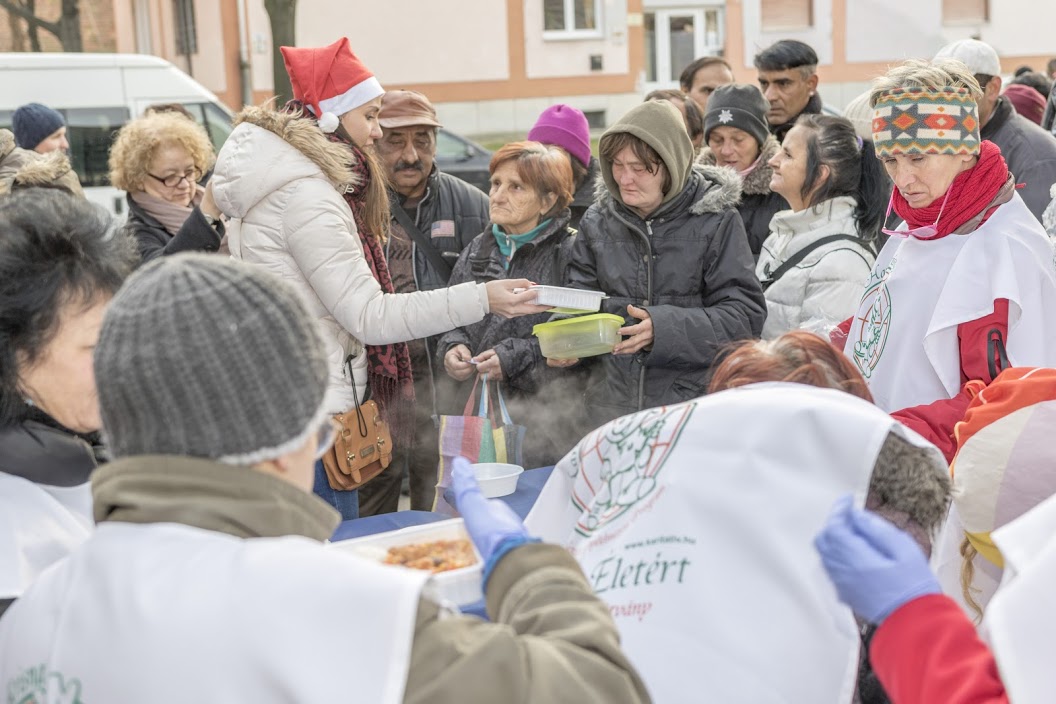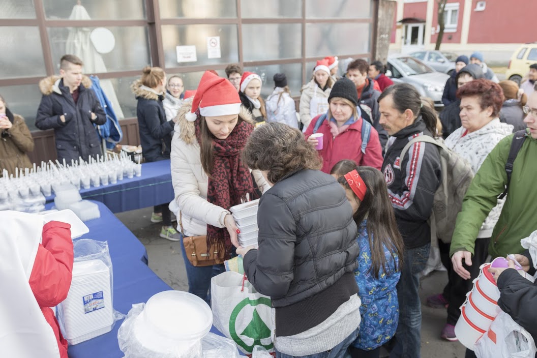 December 4-én pécsi Ételt az Életért Programunk megkezdte az év utolsó kiemelt ételosztásait. A nagy hideg és a közbe eső nehézségek ellenére jól sikerült. Most is a Heti Betevő csapatával közösen szerveztük meg az akciót. A saját és a betevők önkéntesein kívül nagy örömmel fogadtuk a pécsi Radnóti középiskola tanulóit 12 fő akik ajándékkal is készültek 🙂 250 adag meleg ételt, chilis babot, zsemlét , édességet, halavát, gyümölcsöt osztottunk. Valamint a nagy hidegben jól esett nekik a meleg tea is, amivel kedveskedtünk amíg sorban álltak. A nehéz sorsú családokat a családsegítő szolgálat értesítette, valamint a környék otthontalan lelkeinek is jutott az ételből.