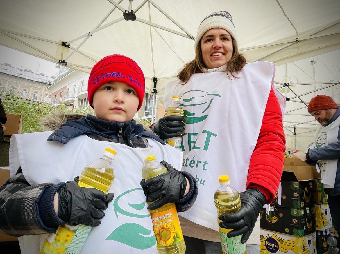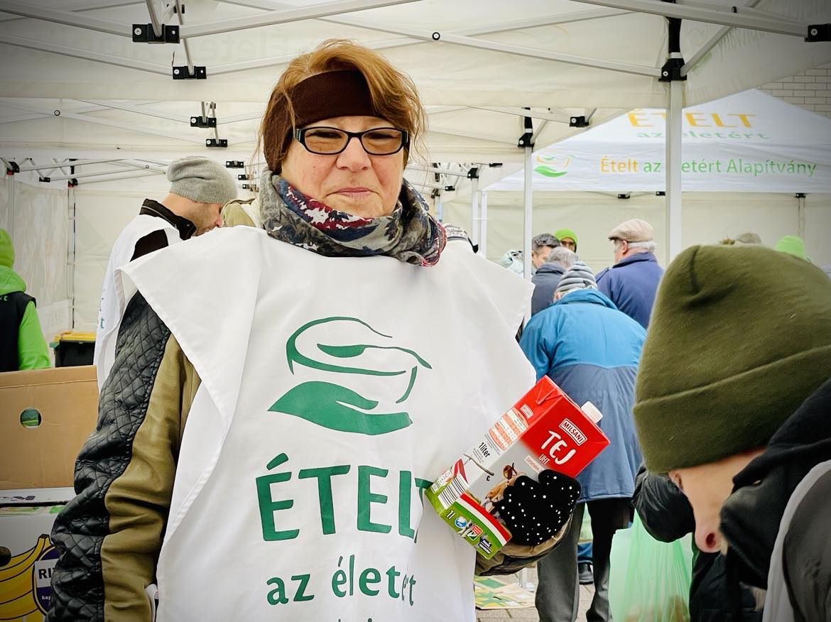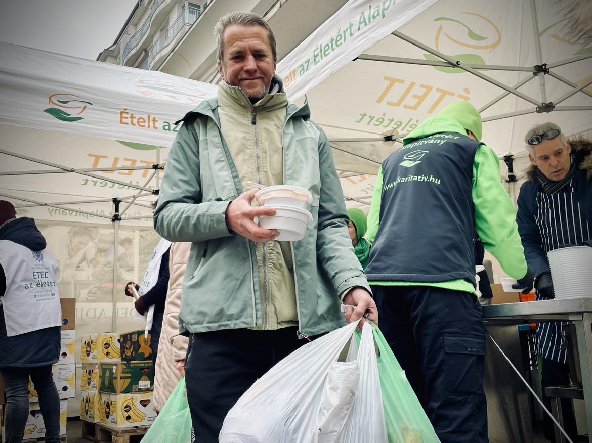 Az első nagy, kiemelt budapesti ételosztásunkat a hévégén tartottuk. Szombaton főként Erzsébetváros lakosságát vártuk ünnepi csomaggal, ahol velünk volt a kerület szociális alpolgármestere, Szücs Balázs is. A 7. kerület is egy olyan régió a fővárosban, ahol mindennapos ételosztással várjuk a rászorulókat, de az ünnepek közeledtével a gazdag, tartós élelmiszercsomag az, amire a családok áhítoznak, ebből ugyanis otthon, együtt tudnak főzni az ünnepekre – és ez valóban összekovácsolja a családokat. Olyan érzést ad, hogy egy kicsit, ha csak pár napra is, de végre minden rendben van. Nem csak főzési alapanyagok, hanem nassolnivalók, finomságok is kerültek a csomagba, amit a sorban látható és idén feltűnően sok gyermek azonnal el is kezdett megdézsmálni. 🙂