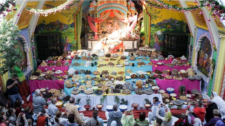 Így aztán fogták mindazt, amit Indra imádatához készítettek elő, és Kṛṣṇa irányítása alatt mindent a Govardhana-hegyhez vittek. Óriási hegyeket halmoztak fel bhogából (annakuta), többszáz-féle fogást nagy mennyiségben, ahogy Kṛṣṇa utasította őket. A brāhmaṇák yajñákat mutattak be és mantrákat kántáltak, a zenészek énekeltek és a hangszereiken játszottak, minden vrajavā végtelen örömmel ünnepelt. Hogy miért? Mert az ő boldogságuk Kṛṣṇának is boldogságot okozott. A vraja-vāsīk csak azért akartak boldogok lenni, mert Kṛṣṇának örömet okoz, ha a bhaktáit boldognak látja. Amikor Rādhā-Giridhāri elé járulunk, táncolnunk kell és énekelni, és boldogan hallgatni a hari-kathát, mert ha mi boldogok vagyunk, amiért Kṛṣṇáról hallunk, akkor Kṛṣṇa is boldog. Ez minden törekvésünk lényege – egyszerűen csak örömöt szerezni Istennek.